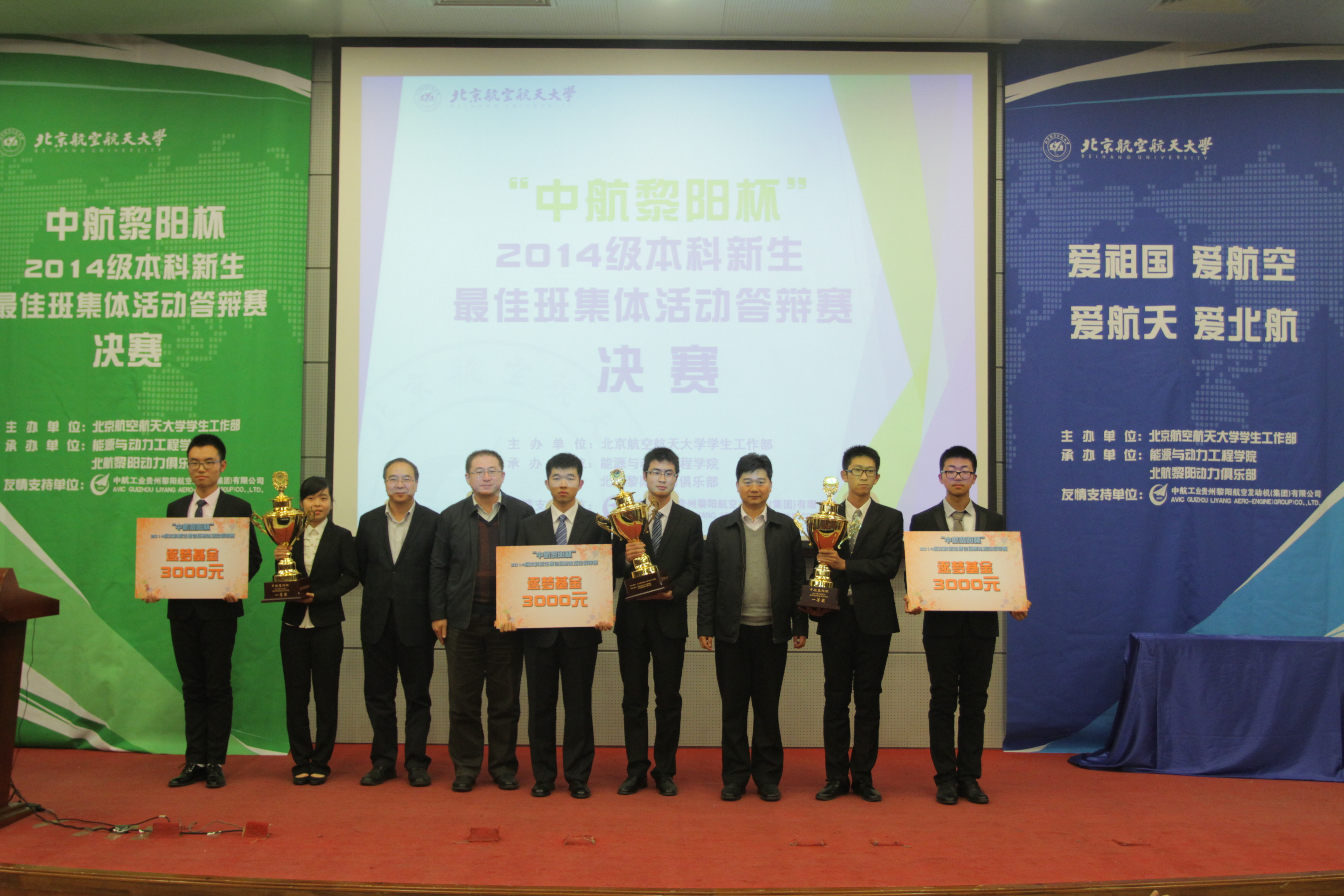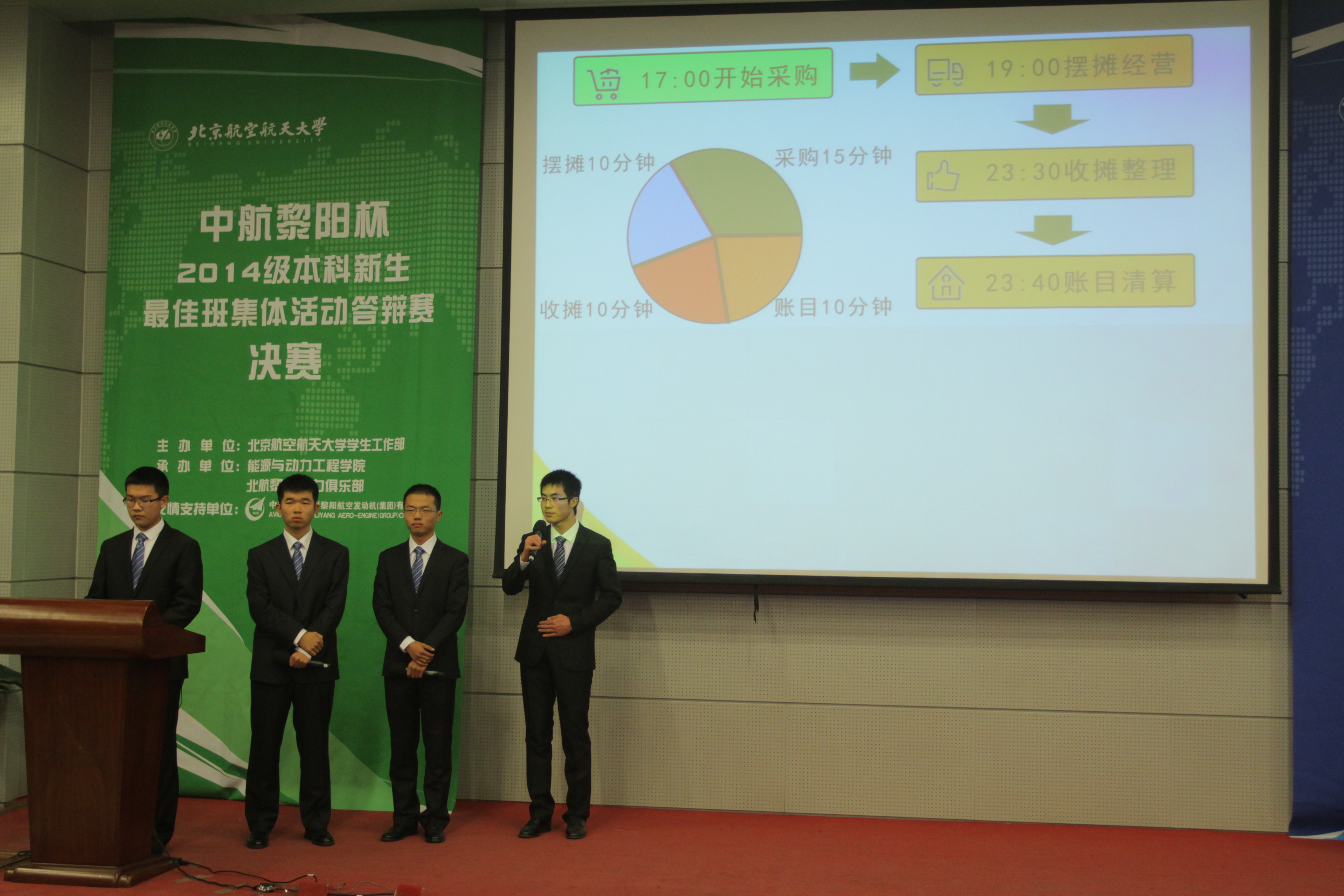 11月26日晚,由北京航空航天大学学生工作部主办,能源与动力工程学院、北航黎阳动力俱乐部共同承办的“中航黎阳杯”北京航空航天大学2014级本科新生最佳班集体活动答辩赛决赛在沙河校区实验四号楼205报告厅顺利举行。