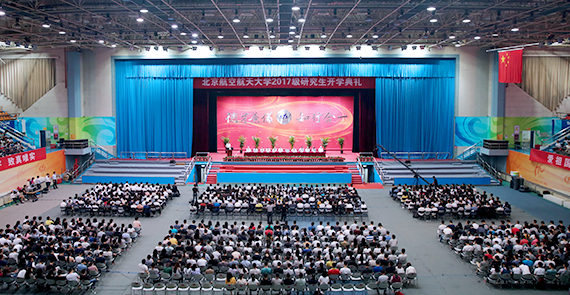 北航新闻网9月15日电(通讯员 胡述伟 刘菂/文 记者 孔祥明 王震/摄影)9月15日上午,北京航空航天大学2017级研究生开学典礼在学院路校区体育馆隆重举行。校党委书记张军院士、校长徐惠彬院士、副校长魏志敏、纪委书记何新洲、副校长陶智、副校长刘树春、副校长房建成、副校长黄海军、校党委副书记李军锋、副校长王云鹏,校友代表、导师代表,各学院、学校机关部处负责人以及5052名2017级研究生新生参加了开学典礼。典礼由副校长黄海军主持。