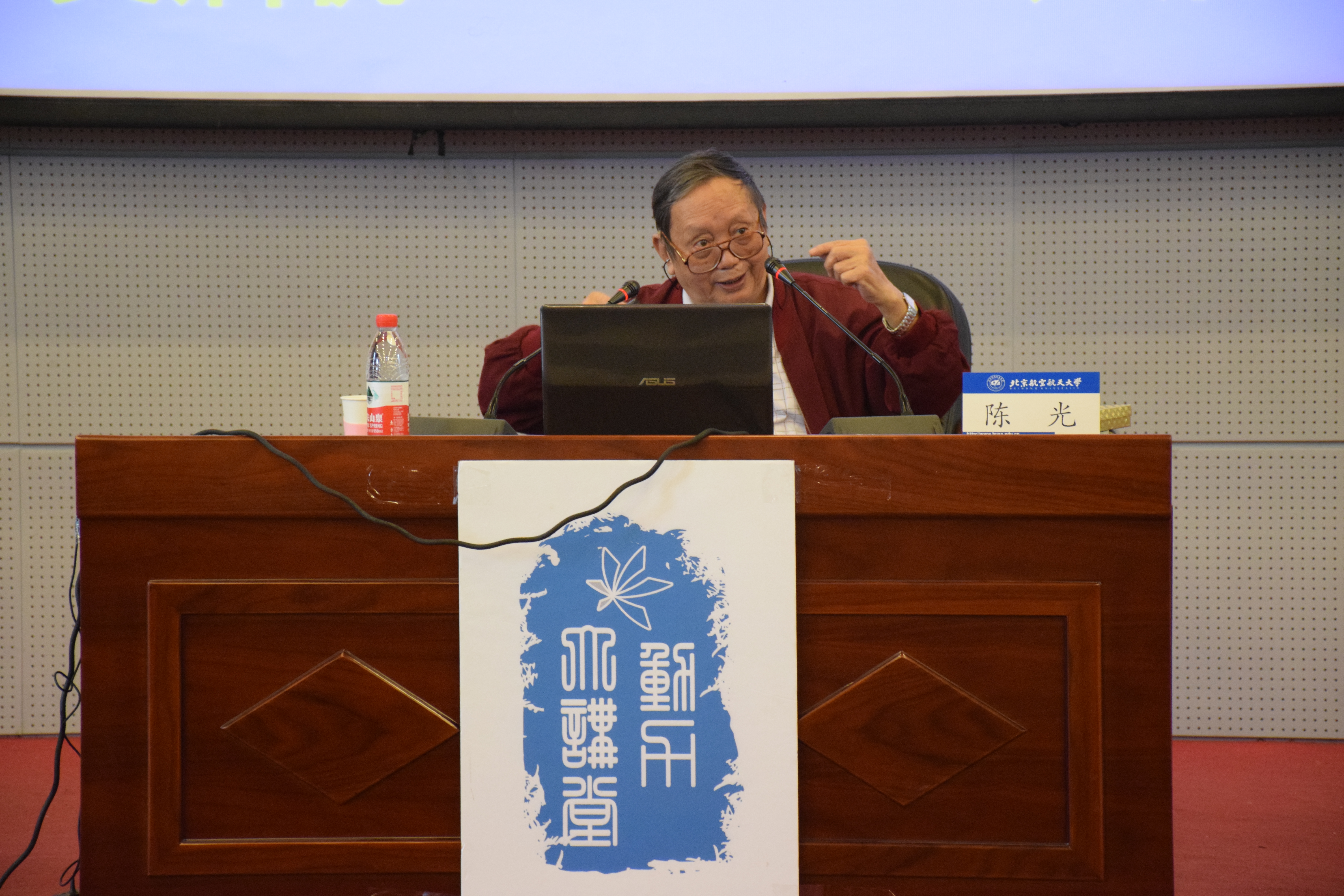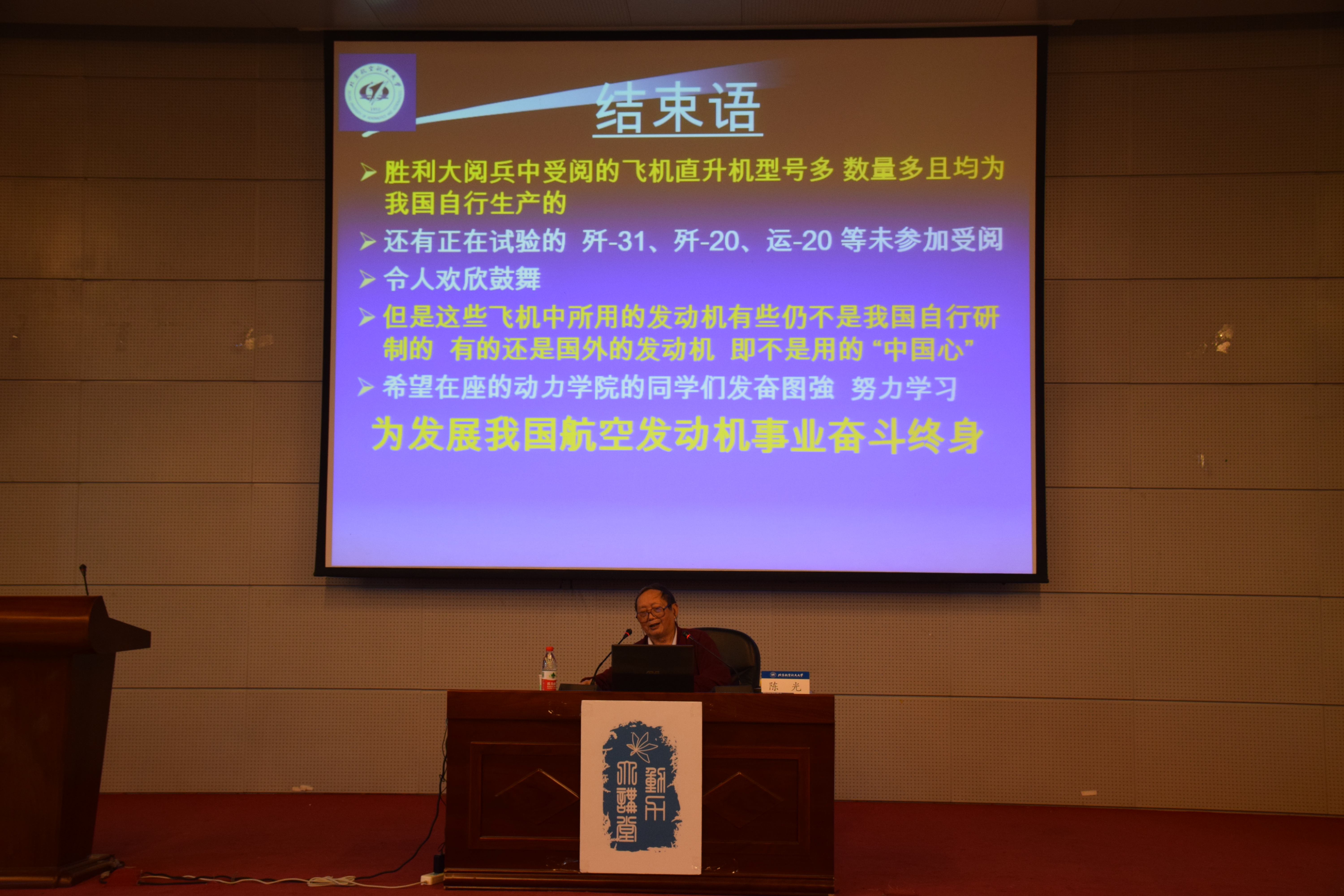 2015年10月17日下午,北航能源与动力工程学院老教授陈光先生来到沙河校区,为同学们带来了题为“巨龙亮剑”——大阅兵中的几型飞机的讲座。讲座开始之前,老教授为同学们讲述了在国家刚刚解放时,前辈们学习生活条件的艰苦,勉励同学们在这生活条件优越的年代要更加努力的学习,对得起老一辈为我们做出的贡献。