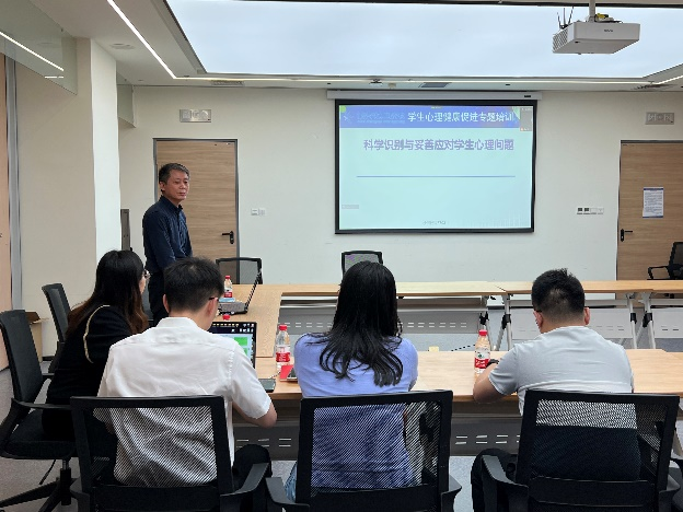 会前,学院邀请了北航积极心理体验中心主任马喜亭教授作题为《科学识别与妥善应对学生心理问题》的专题培训。马喜亭从“谁可能有心理问题”、“学生心理危机信号”、“妥善应对危机学生”等三个方面分享了应对大学生心理问题的宝贵经验。他指出,精准感知是有效干预的基础和前提,学会如何识别心理危机信号是高校心理危机干预工作的重点。在后续的干预过程中,敏锐的觉察是成功沟通的必要条件,尊重差异是提高沟通效果的重要核心,“在关心呵护和暖心帮扶中开展教育引导”是根本保证。