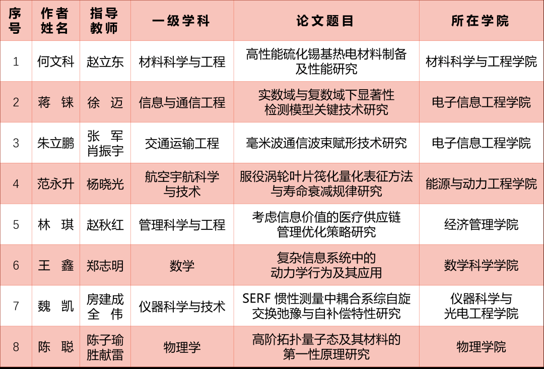 近日,北京市教育委员会、北京市学位委员会开展了2022年北京市优秀博士学位论文评选工作,共评出北京市优博123篇,北京市优博提名46篇。北京航空航天大学共有8篇论文获评北京市优秀博士学位论文。