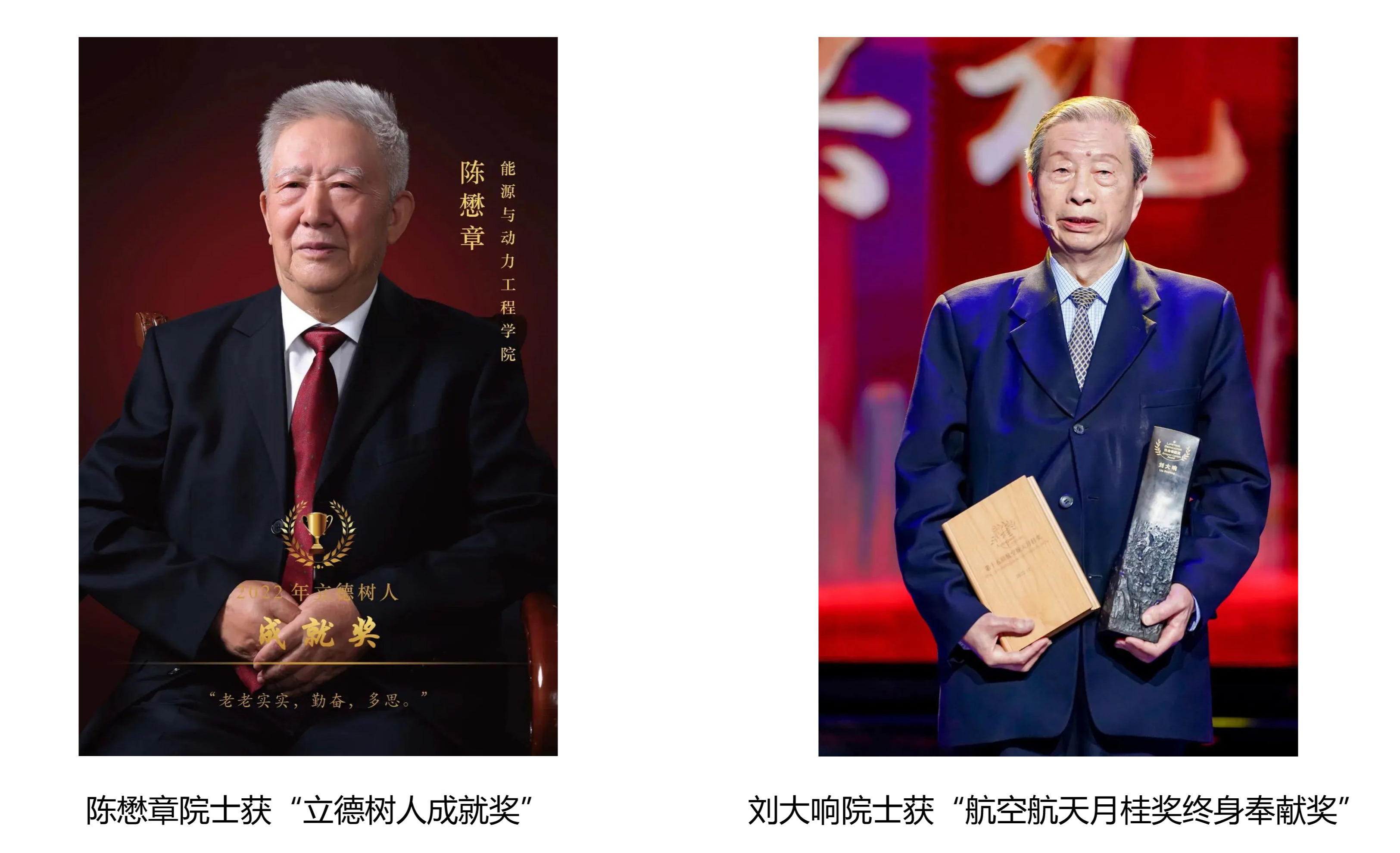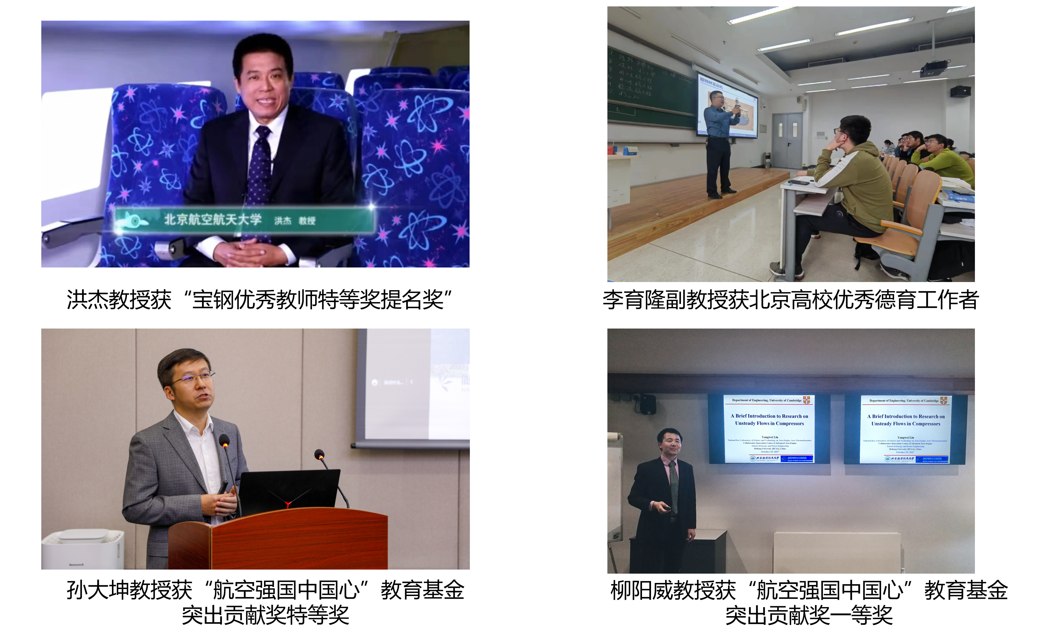 陈懋章院士获得北航人才培养最高荣誉—“立德树人成就奖”。陈懋章院士是北航首届学生,毕业留校任教并工作至今,扎根讲台广育英才,深耕专业科研报国,心系学校爱生如子,热心公益奋斗不止,是北航当之无愧的“大先生”。学院刘大响院士获得中国航空航天领域最高荣誉—“航空航天月桂奖终身奉献奖”以及“首都精神文明建设奖”。刘大响院士深耕远山三十年,打造出全球领先的航空发动机高空模拟试车台,让中国实现了从0到1的突破。主持关键技术预研,制定我国航空动力跨世纪战略发展路线,为中国航空发动机事业贡献大智慧。洪杰教授获宝钢优秀教师特等奖提名奖,李育隆副教授获北京高校优秀德育工作者,孙大坤教授、柳阳威教授分别获“航空强国中国心”教育基金突出贡献奖特等奖、一等奖。