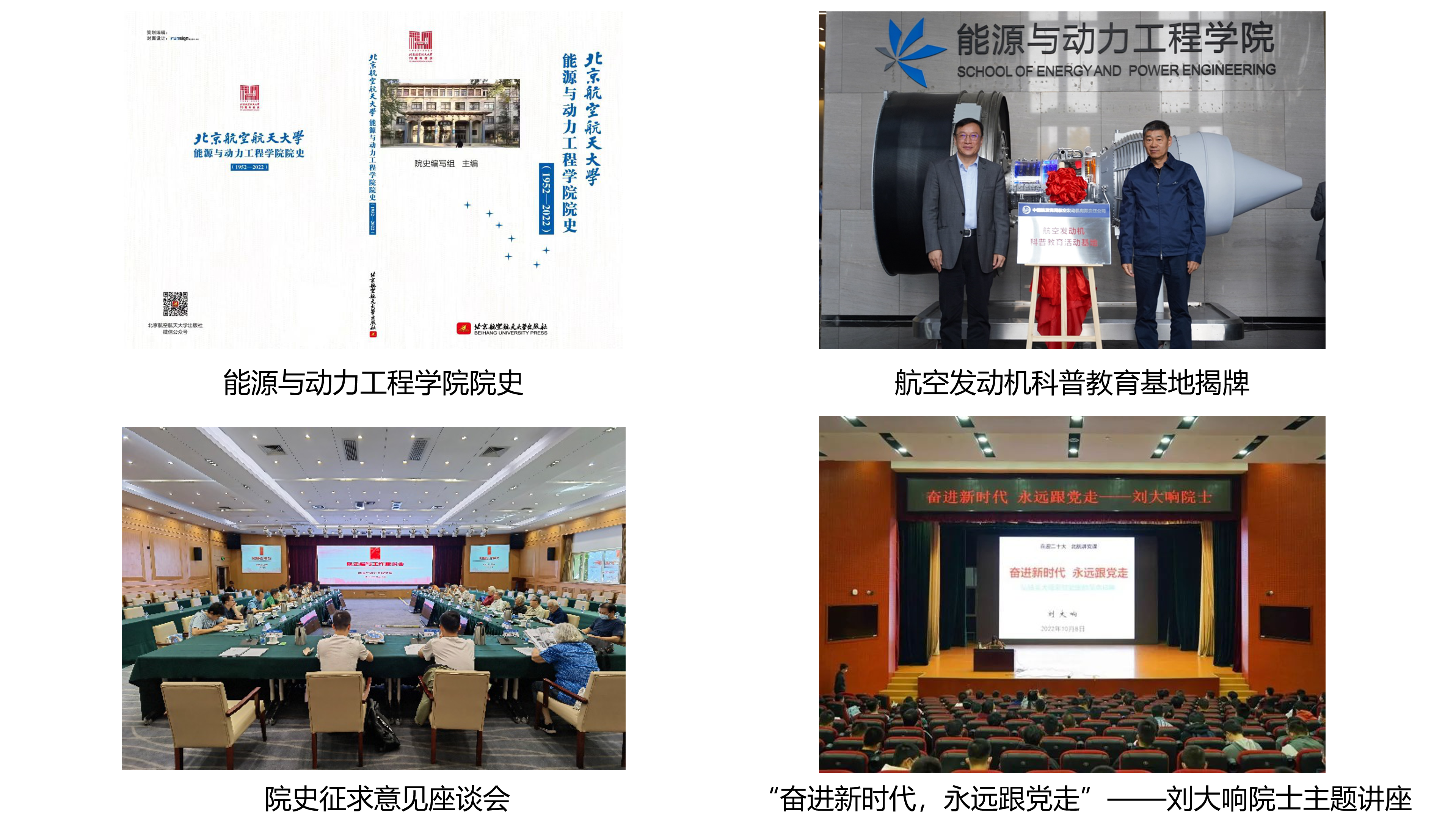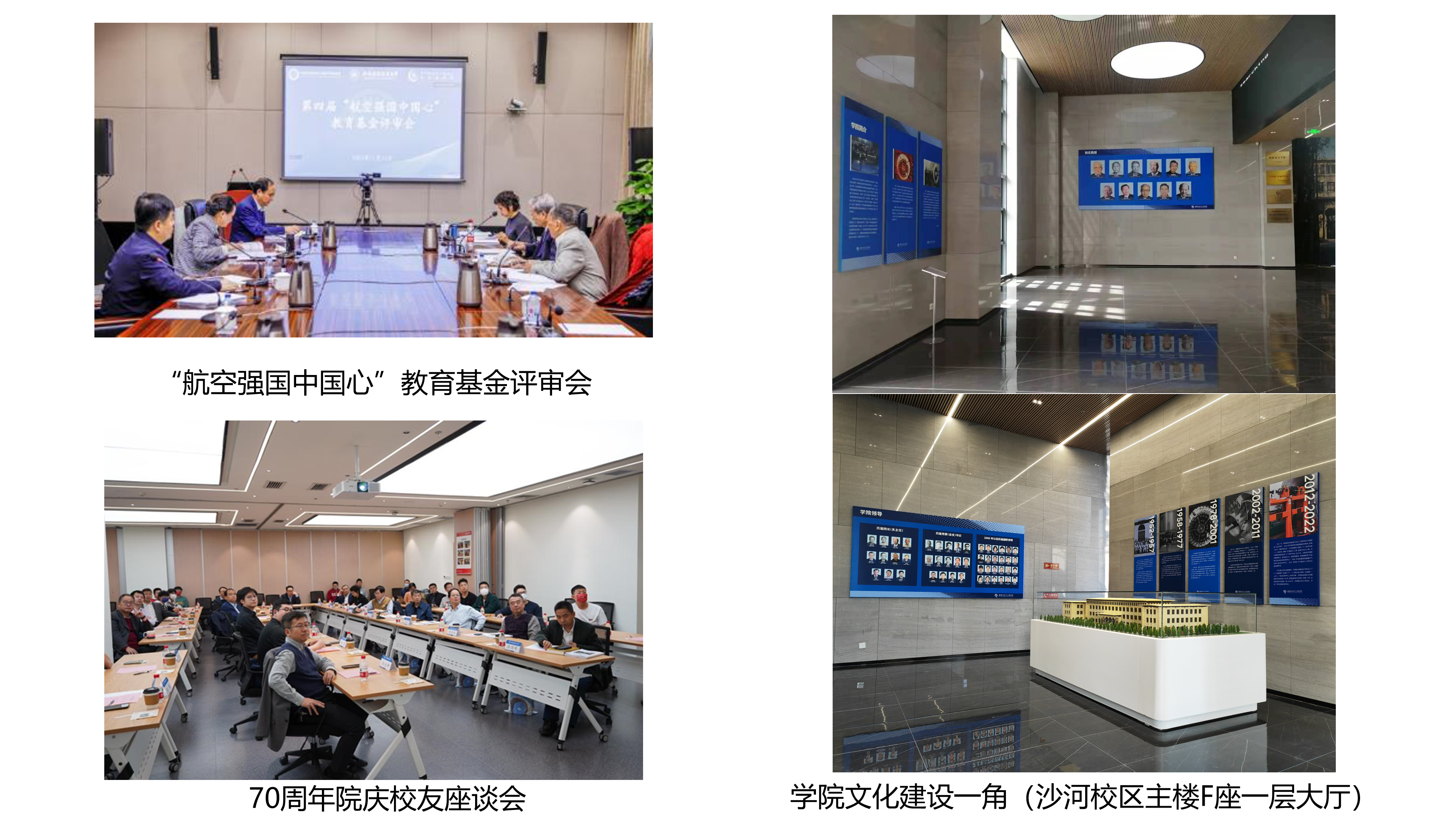 学院庆祝建院70周年,历时三年完成院史编写,整理和展示三代人奋斗历史和办学经验,以及在人才培养、科学研究和学科建设等方面取得的优异成绩,传承和弘扬“自强中国心”精神。完成第四届“航空强国中国心”教育基金评审,奖励航空发动机领域做出突出贡献的全国优秀青年人才。与中国航发签订“心智”励业金和校园菁英联合培养基地。召开校友座谈会,共同谋划学院未来发展。累计获得各类捐赠255万元(边程、关琪校友100万元、中发天信集团50万元、无锡乘风航空工程技术有限公司50万元、中国航发集团25万元、四川燃气涡轮研究院30万元),两台自主研制的航空发动机(由中国航发黎明、中国航发商发提供),建立航空发动机科普教育基地。