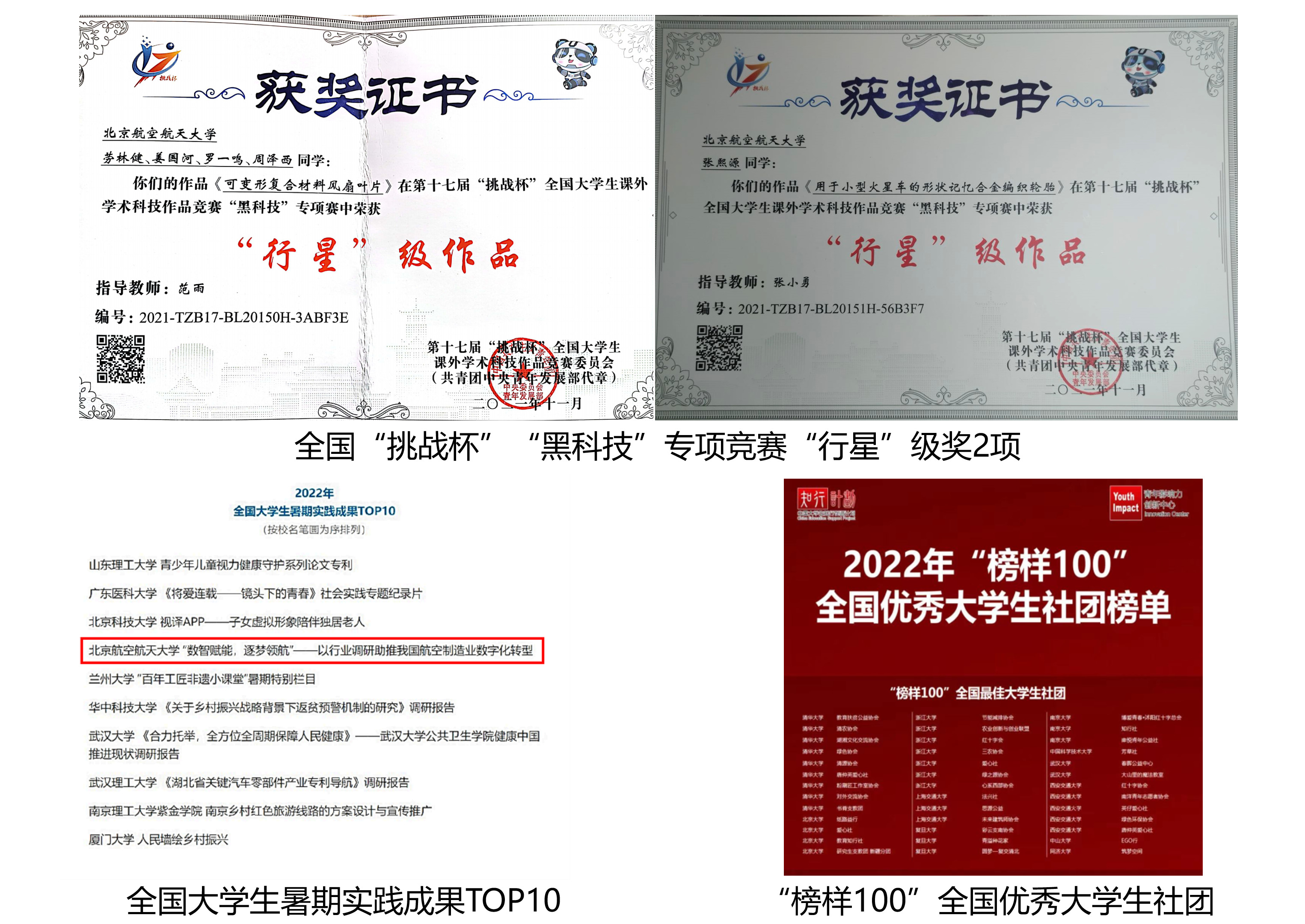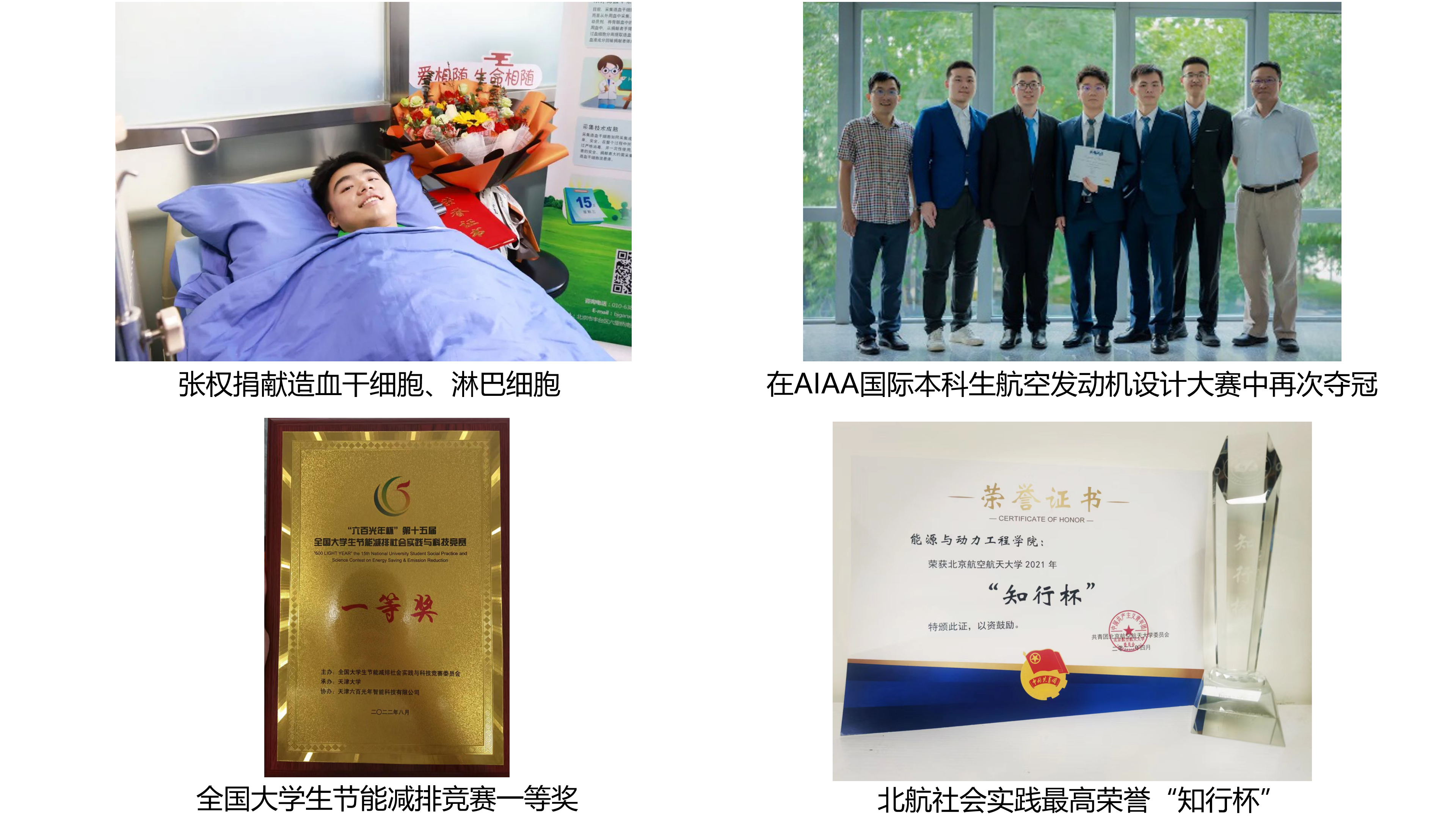 我院学子在2022年奋发有为,获得校内外多项荣誉。博士生张权一年内两次无私捐献造血干细胞、淋巴细胞,获“北航榜样——大学生年度人物”见义勇为之星。范永升博士学位论文入选北京市优秀博士论文。学生团队在国际AIAA本科生航空发动机设计大赛中再次获得冠军。学院学子获全国大学生节能减排竞赛一等奖,全国“挑战杯”“黑科技”专项竞赛“行星”级奖2项,“互联网+”大学生创新创业大赛“青年红色筑梦之旅”赛道二等奖,北航研究生优秀科技创新团队奖学金。心起点实践队获“全国大学生暑期实践成果TOP10”、“青年服务国家”首都大中专学生社会实践优秀团队,实践社获“榜样100”全国优秀大学生社团。学院获北航社会实践最高荣誉“知行杯”。1个党支部获北航优秀主题党日活动,4个党支部获北航党支部创新基金。180441班获北京市先进班集体、“先锋杯”活力团支部,190441班获北航“十佳班集体”、标兵团支部,200441班获北航活力团支部。学院获校“航篮杯”沙河校区冠军、校飞盘联赛沙河校区冠军、校运会研究生团体第1名。