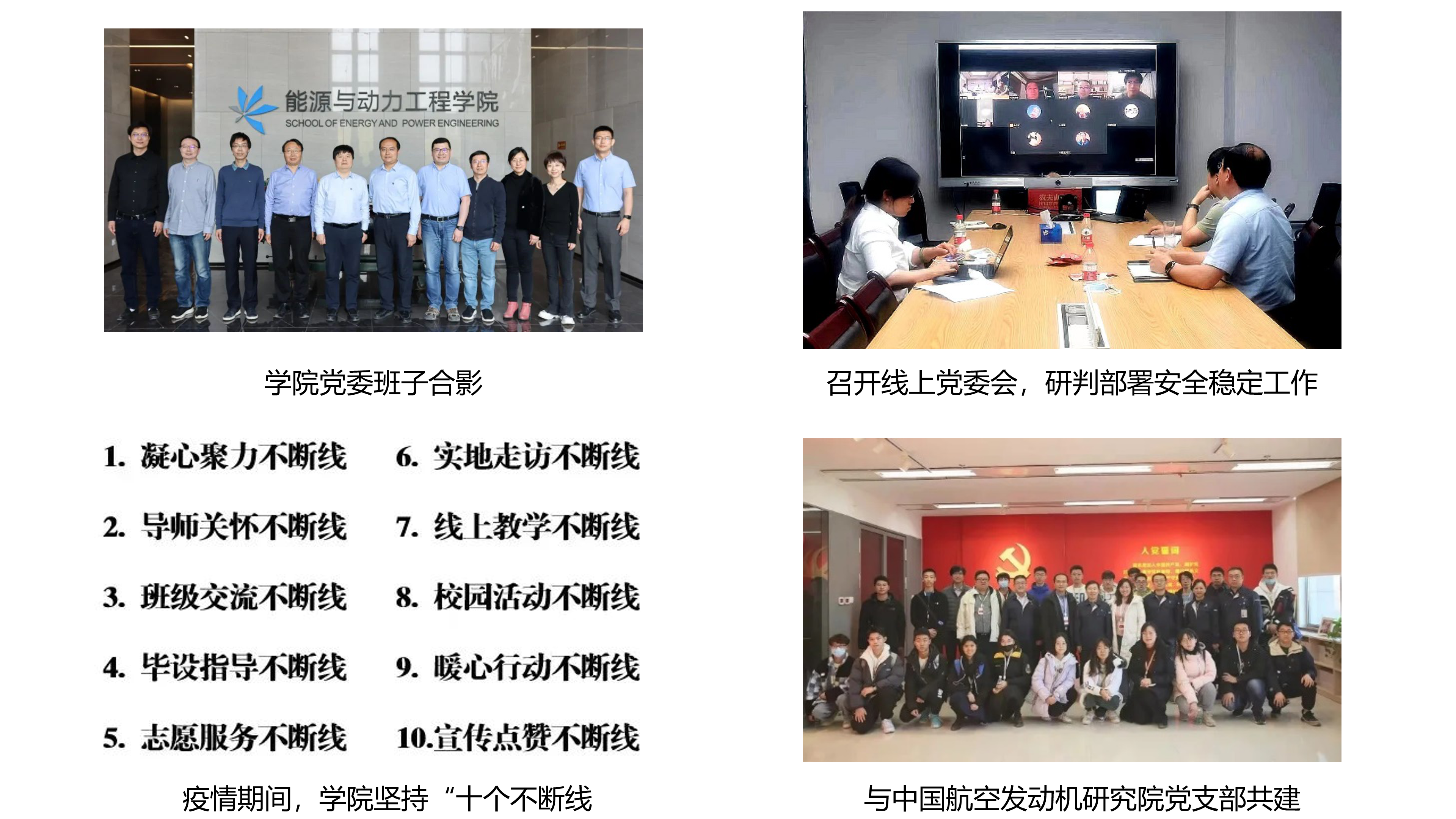 学院党委坚持以习近平新时代中国特色社会主义思想为指导,深入学习宣传贯彻党的二十大精神,落实立德树人根本任务,凝练建院70年“自强中国心”精神,奋力培养服务国家战略需求和引领时代发展的航空发动机“两领”人才。在“全国党建工作标杆院系”的两年培育创建期内,学院党委把握新形势新要求,实施党建“四心”(定心、聚心、暖心、动心)工程,推动党建工作与事业发展深度融合,统筹做好疫情防控和日常教学科研工作,全面实施“五个到位”,以高质量党建引领学院内涵、特色、高质量发展,顺利通过教育部第二批“全国党建工作标杆院系”建设单位验收。