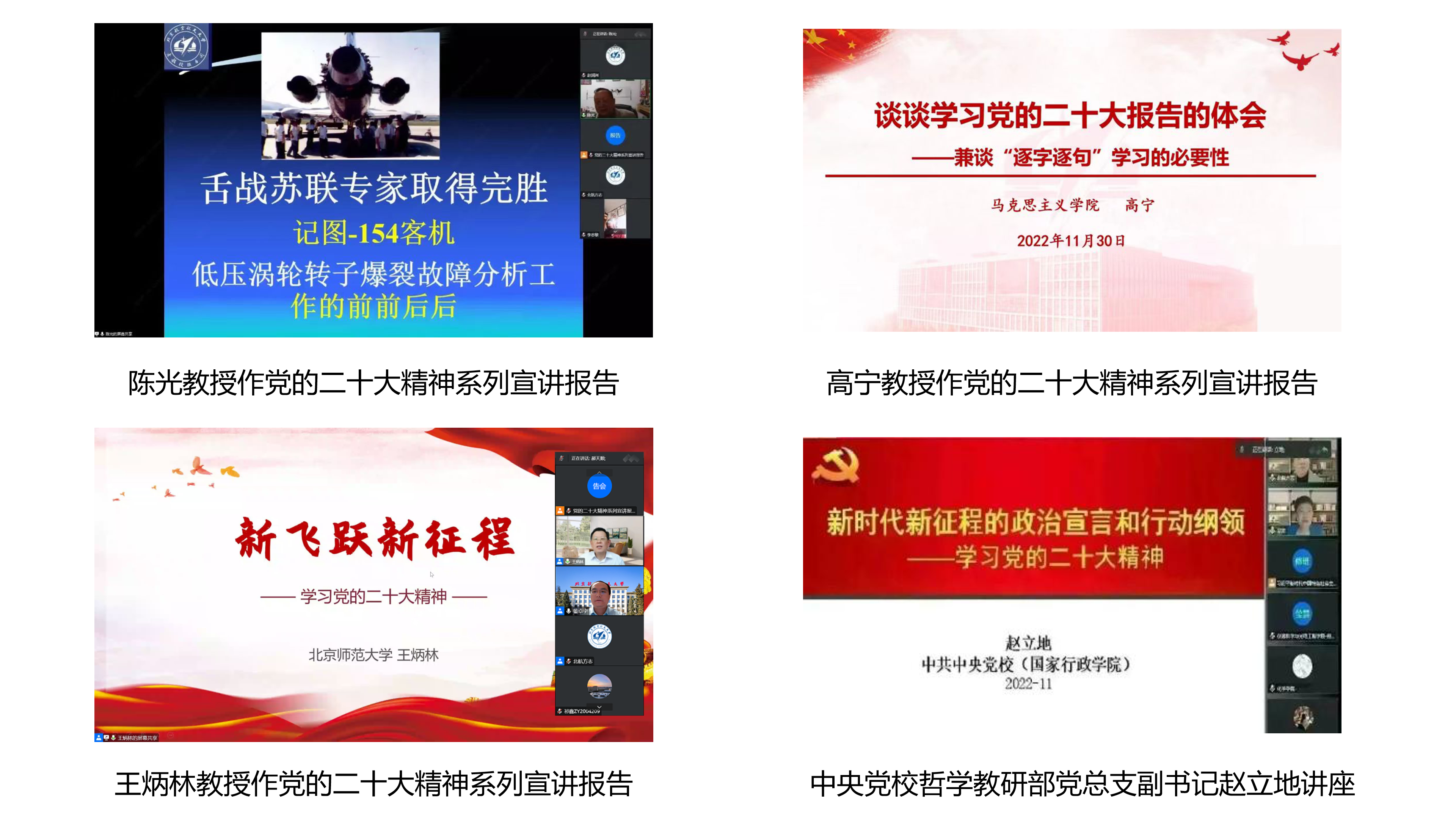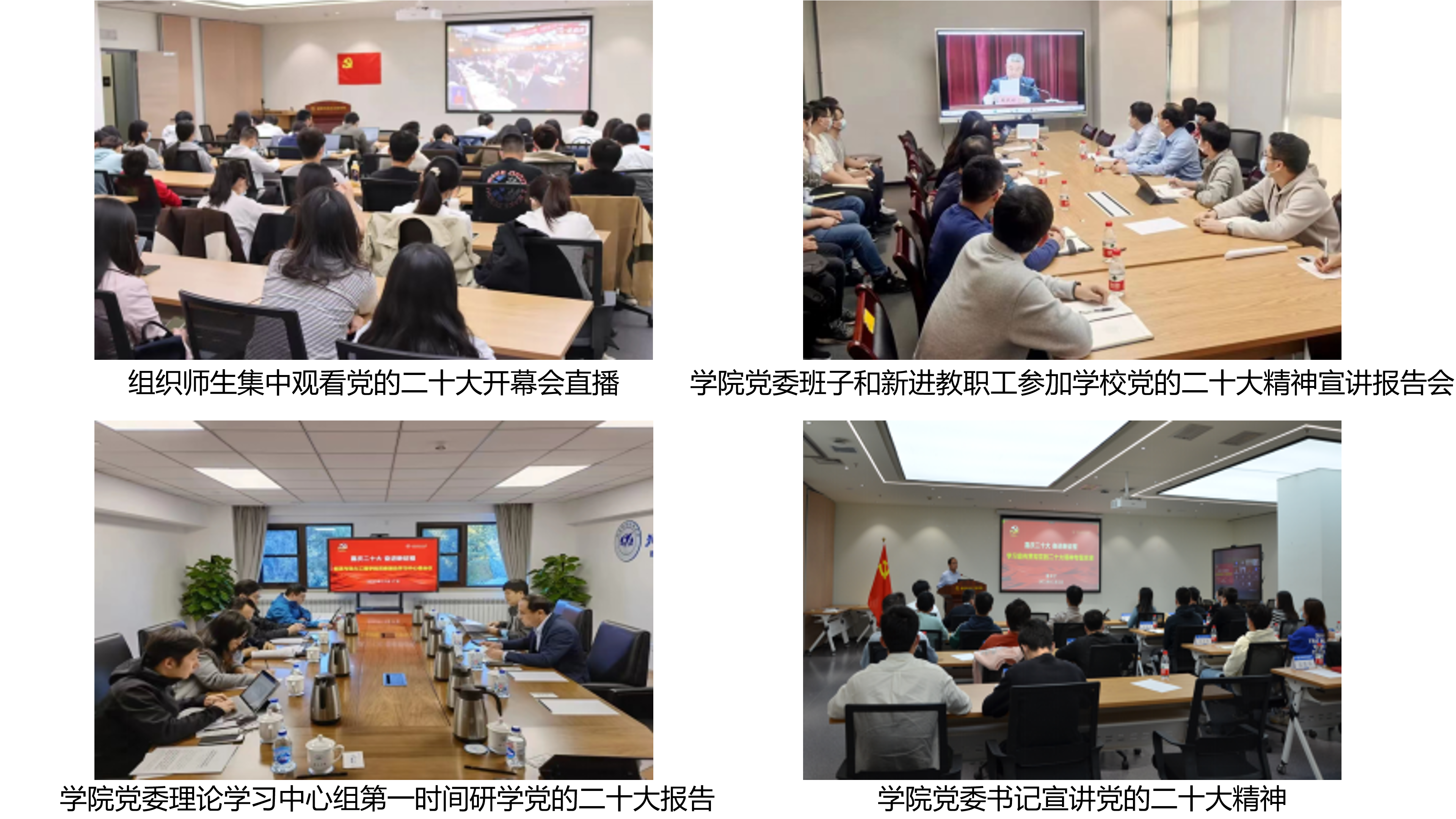 学院党委将学习宣传贯彻党的二十大精神作为首要政治任务,坚持学深悟透是基础、融会贯通是关键、全面落实是目的,制定实施方案,包括6类37项具体举措,迅速掀起学习热潮。党委书记带头开展宣讲,党委理论学习中心组每周1个专题学习,原原本本学报告,结合业务逐一发言,与机关部处、兄弟学院、基层支部开展联学,努力做到武装头脑、指导实践、推动工作有机结合。组织师生观看党的二十大开幕会直播,线上线下相结合开展系列宣讲报告会、全体支部书记系列集体备课会,利用“学习日”、“三会一课”、党团课等组织学习宣讲,引导全院师生深刻领悟“两个确立”的决定性意义,推动党的二十大精神走深走实,并转化为学院高质量发展的强大力量。