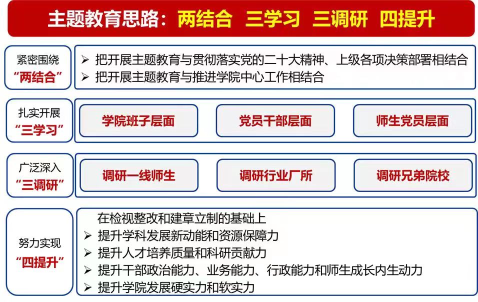 董卓宁阐述了党中央关于主题教育的重要指示精神,强调高质量开展主题教育是当前首要的政治任务。在校党委领导下,学院党委紧紧围绕“两结合”,扎实开展“三学习”,广泛深入“三调研”,努力实现“四提升”,以推动各项事业高质量发展、提高师生归属感获得感认同感的新成效检验主题教育成果。