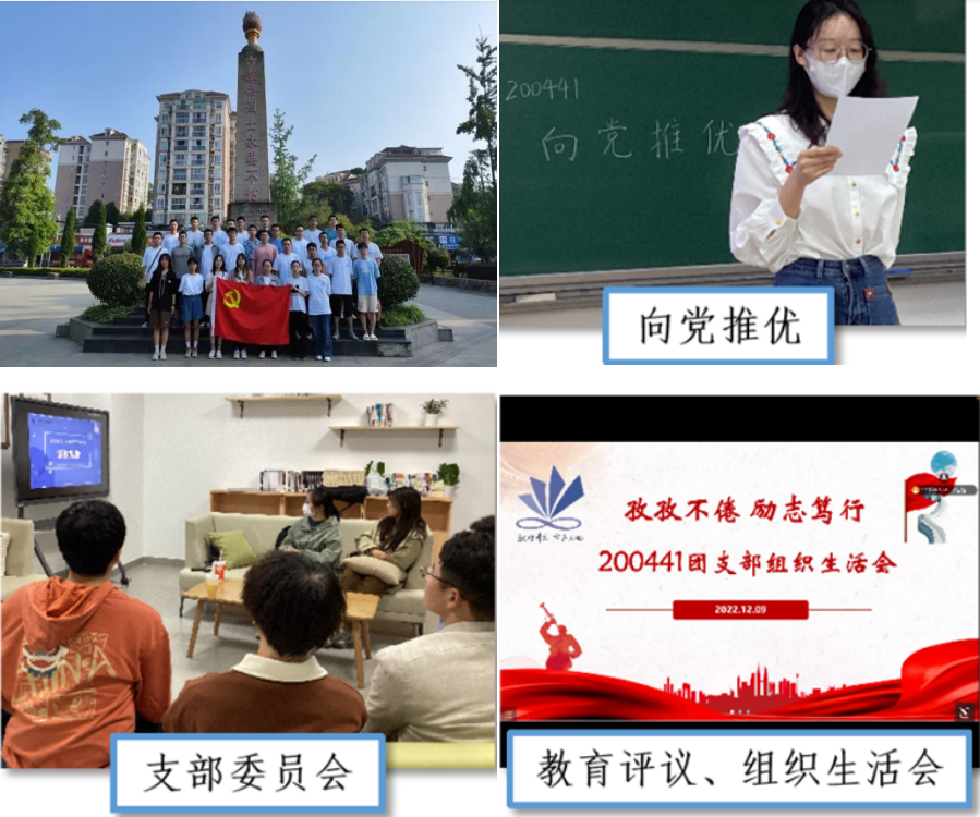 200441团支部一颗红心向党,积极向党组织靠拢。支部积极落实“三会两制一课”制度,在学院内示范性开展组织生活会,积极开展学习日、主题团日,平均参与率均达95%,青年大学习完成率100%。