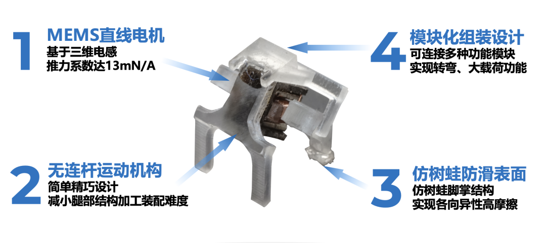 项目简介:本项目提出了一种MEMS技术加工制作的超微型高机动机器人平台:其动力系统是团队首创的MEMS三维电感为核心的超微型直线电机;将树蛙脚掌结构用于足部,大幅提升运动能力;运动系统具有多模态与模块化组合的优点,易实现未来不同需求。机器人体积小于5mm*5mm*5mm,速度接近48倍体长每秒、4倍自重负载、20°爬坡、40%体高越障、260°/s转向角速度,各项性能达国际领先水平,在精密仪器检测等领域应用前景广阔,已获得国防院所应用前景认证,与三家龙头企业达成初步合作意向,并获得中央广播电视总台、北京电视台等主流媒体的宣传报道。本科生科研团队以学生一作授权专利一项、受理两项、并以一作发表EI期刊一篇。中央广播电视总台采访报道,朝闻天下、央视新闻新媒体端播出。