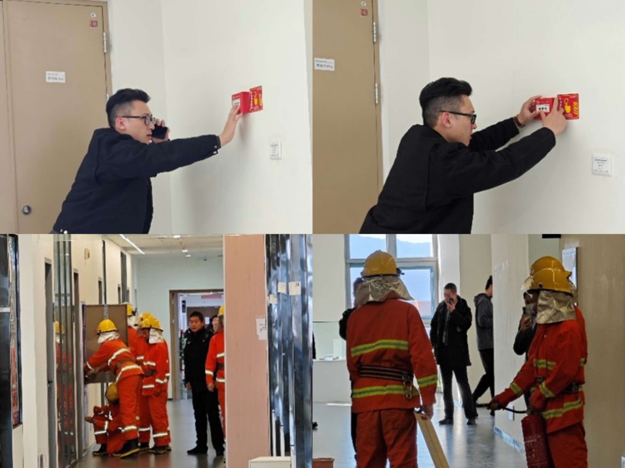下午14:00,一名同学“发现”F座6层西侧楼梯间的模拟火情,第一时间通过手动报警装置报警并报告学院消防安全领导小组。学院消防安全领导小组立刻将火情通报全体师生,并根据《消防安全应急方案》,各层安全负责人组织参加演练的师生从安全路线有序撤离。接到报警后,校消防站队员迅速赶到现场并扑灭火灾。
