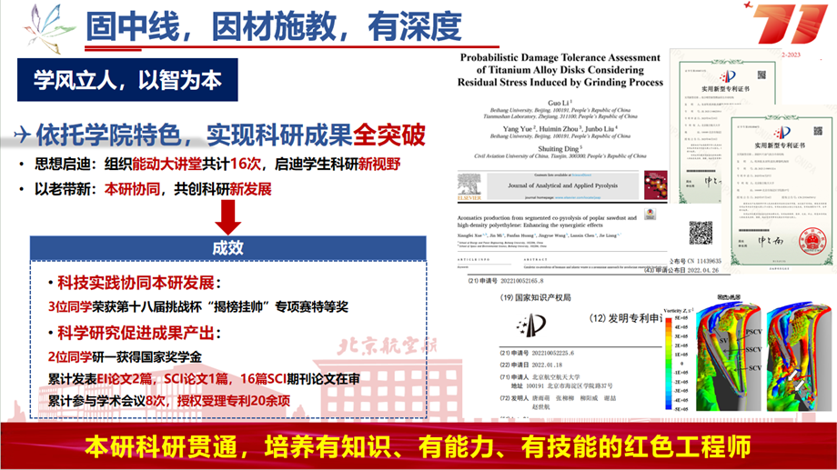 总结学生面临的三多三少局面,把准学生认同问题。以就业问题为导向,长远立足,带领学生线下实地走访企业,树立文化认同,提高行业认知,培养有志于服务国家重大战略需求的红色工程师。学生积极参与科研工作,实现科研成果多方位突破。