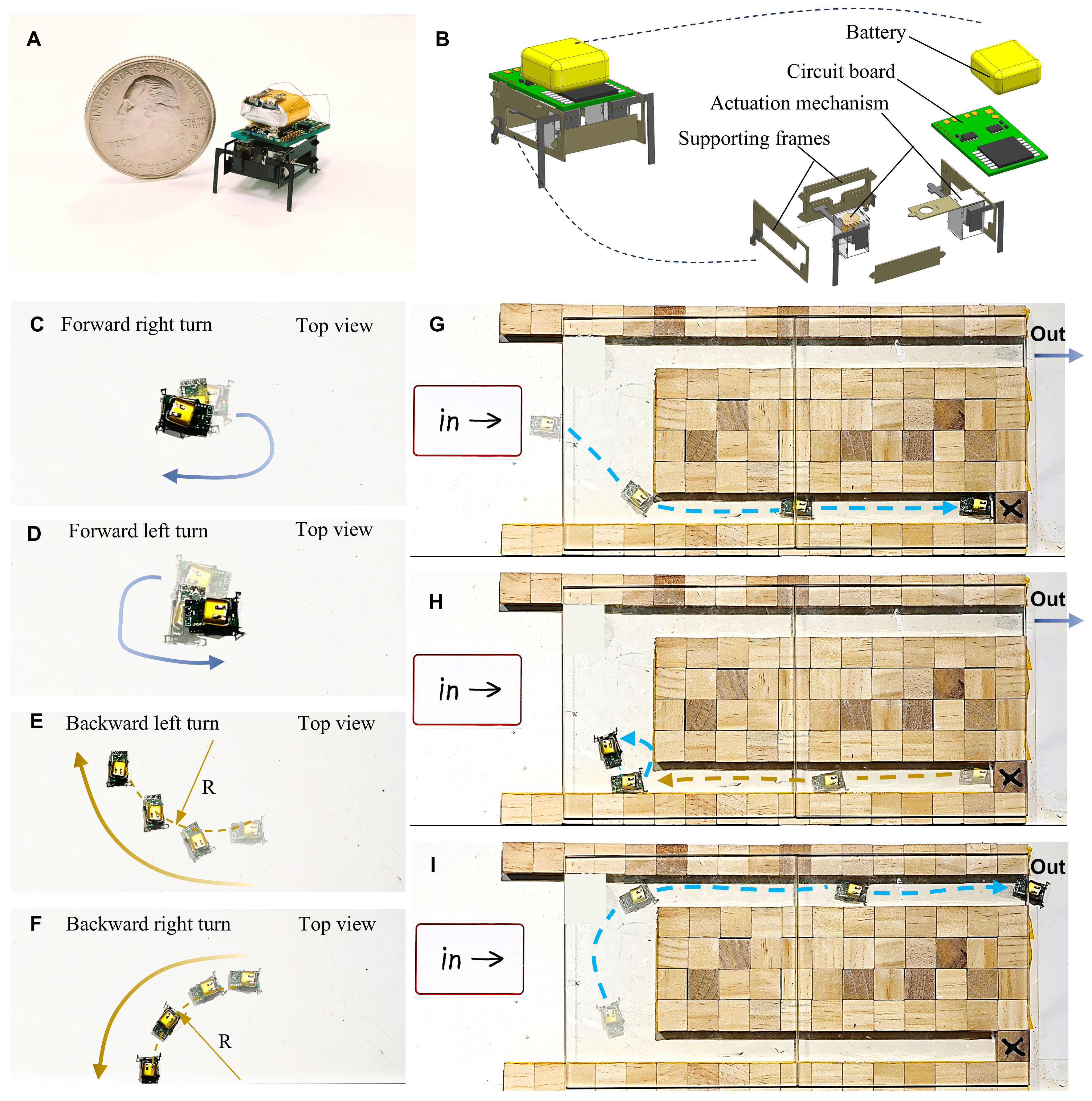 针对机器昆虫的无线控制难题,本次研究针对BHMbot-B机器昆虫提出的前进后退控制方法与前期BHMbot采用的频率差分爬行方向控制方法具有良好的兼容性。在上述控制方法的基础上,团队研发了可调频带更宽的控制电路,BHMbot-B机器昆虫集成微型能源、控制和通讯模块后(身长2cm,质量1.89g),可通过无线控制实现前进后退双向爬行、左转和右转等基本运动,通过上述基本运动的组合,BHMbot-B机器昆虫可顺利退出狭窄封闭单向通道(图3,视频3)。