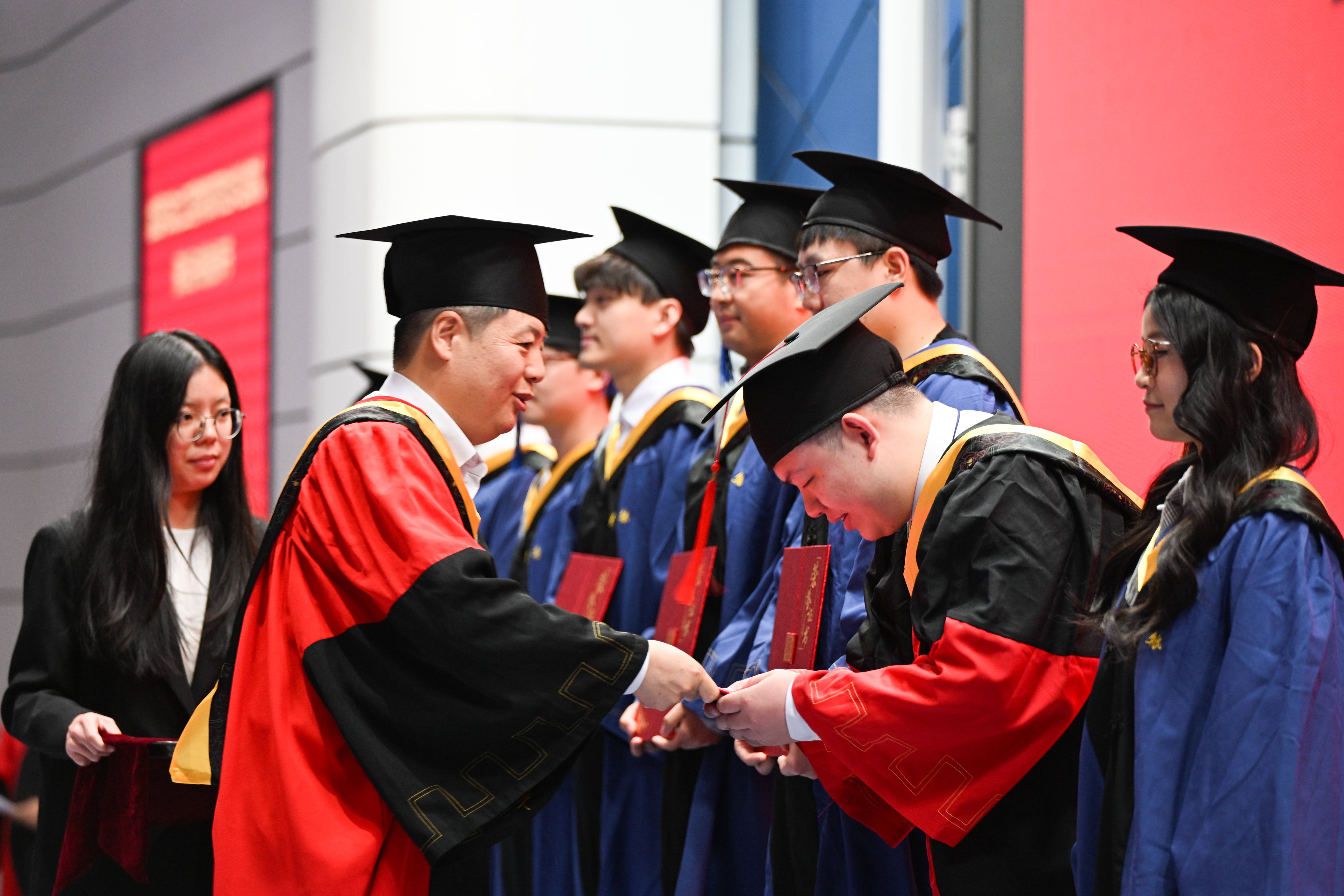 典礼的最后是2025届研究生毕业生学位授予仪式,院领导及导师代表为在场的毕业生拨苏正冠,送上美好祝愿。
