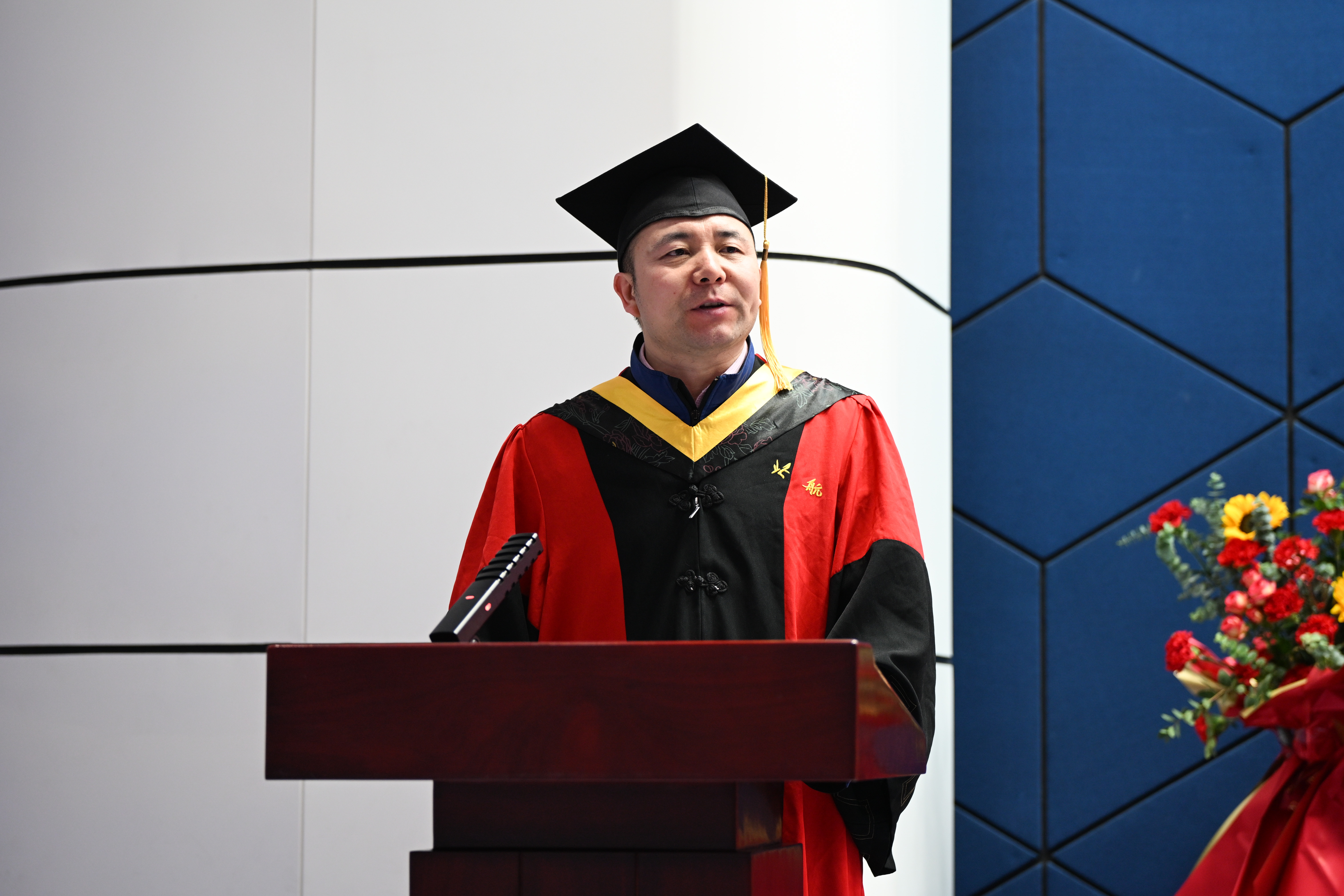 学院院长闫晓军代表学院向顺利完成学业的硕士及博士毕业生表示热烈祝贺,向辛勤付出的研究生导师和教职员工致以衷心的感谢。他回顾了这几年动力学子与国同行所经历的大事,肯定了同学们勇敢追梦、全面发展。闫晓军提出三点希望与2025届研究生毕业生共勉:第一,爱党报国,从校史院史中汲取奋进力量。人生的理想各有不同,但胸怀“国之大者”,服务国之所需,无疑是最为高远的志向。第二,终身学习,从勇于实践中锤炼过硬本领。“学如逆水行舟,不进则退”,把勤奋学习作为价值追求和人生态度。第三,团结拼搏,在凝聚力量中开创美好未来。“独行者速,众行者远”,希望大家传承好北航人团结拼搏的光荣传统,争做团结拼搏的奋斗者。