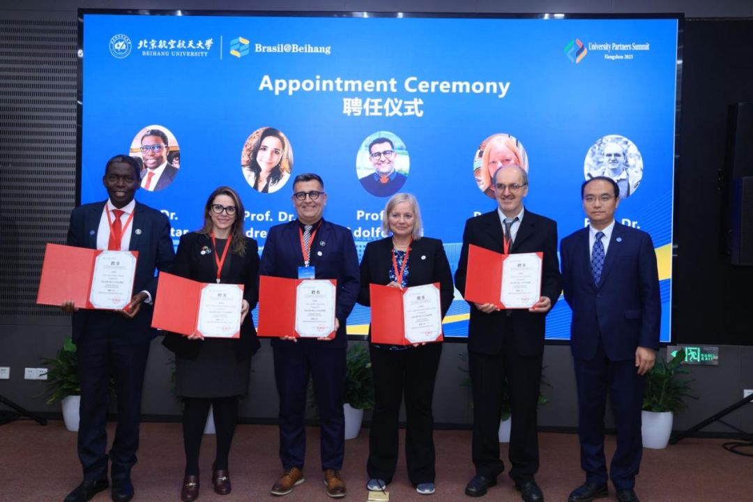 2025年10月20日至10月22日,第23届中国国际人才交流大会、第二届北航全球合作伙伴峰会(UPS)分别在上海与杭州召开。能源与动力工程学院联合北航巴西中心邀请包含巴西科学院院士Julio Romano Meneghini在内的23位外国专家参加两场大会,并借此机会共商前期已签署合作协议的“北航-圣保罗大学绿色航空实验室(BUGA Lab)”在杭州校园落地建设事宜,为Julio Romano Meneghini教授和Hamilton Varela教授颁发聘书。