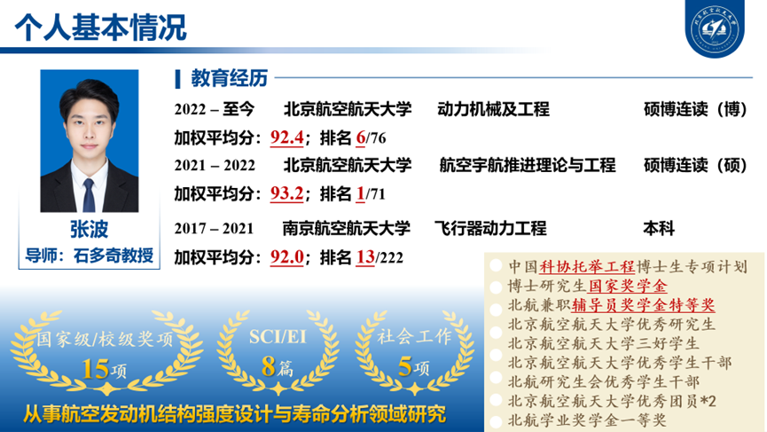 张波,中共党员,2022级博士研究生,致力于航空发动机结构强度设计与寿命分析领域研究。在石多奇教授和刘长奇副教授的悉心指导下以第一作者/学生一作发表学术论文6篇,入选全国首届中国科协青年人才托举工程博士生专项计划。担任博士生思政辅导员、北航研究生会联络交流中心主任等5项社会工作,荣获博士国家奖学金、北航优秀学生兼职辅导员奖学金特等奖等荣誉奖励15项。