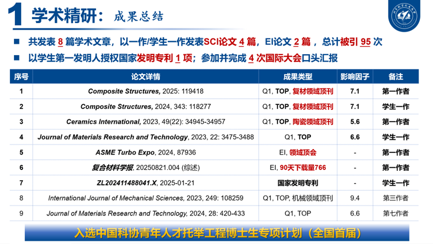 在科研道路上,张波始终坚持以国家重大需求为牵引,其研究成果得到国内外权威认可,被英国皇家学会院士、中国工程院外籍院士Philip John Withers等10余位知名学者正面引用与高度评价。围绕损伤演化机制建模、物理信息融合和智能预测等方向,张波以第一作者/学生一作发表SCI论文4篇(均为Q1/Top期刊),EI论文2篇,授权国家发明专利1项。先后在涡轮机械、复合材料领域等4次国际高水平大会作口头报告,持续提升科研影响力与国际视野。
