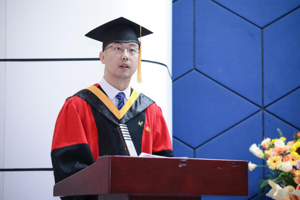 毕业生代表张楼悦向母校、学院、老师和亲友表达衷心感谢。他回顾了在校期间与同学们共同经历国家与学校的重要时刻,见证了“北航四系,王牌动力”的传承与荣耀。科研路上他深深体会到“静水流深”的力量,感恩学院与导师培养出坚韧不拔、脚踏实地的学术品格。他号召全体毕业生肩负起新时代航空动力人的使命,扎根奋斗、绽放芳华。