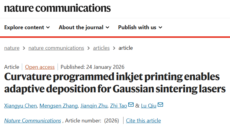 北京航空航天大学能源与动力工程学院陶智院士领衔的朱剑琴/邱璐教授团队在《自然-通讯》(《Nature Communications》)发表题为“Curvature programmed inkjet printing enables adaptive deposition for Gaussian sintering lasers”的研究论文,提出一种“沉积厚度—激光光强匹配”策略,创新性地解决了激光能量分布不均及现有调控方法的缺陷,为基于喷墨打印的高性能高温共形薄膜传感器低成本、规模化制备提供了可行方案,也为激光烧结熔化技术在的优化升级提供了新思路。