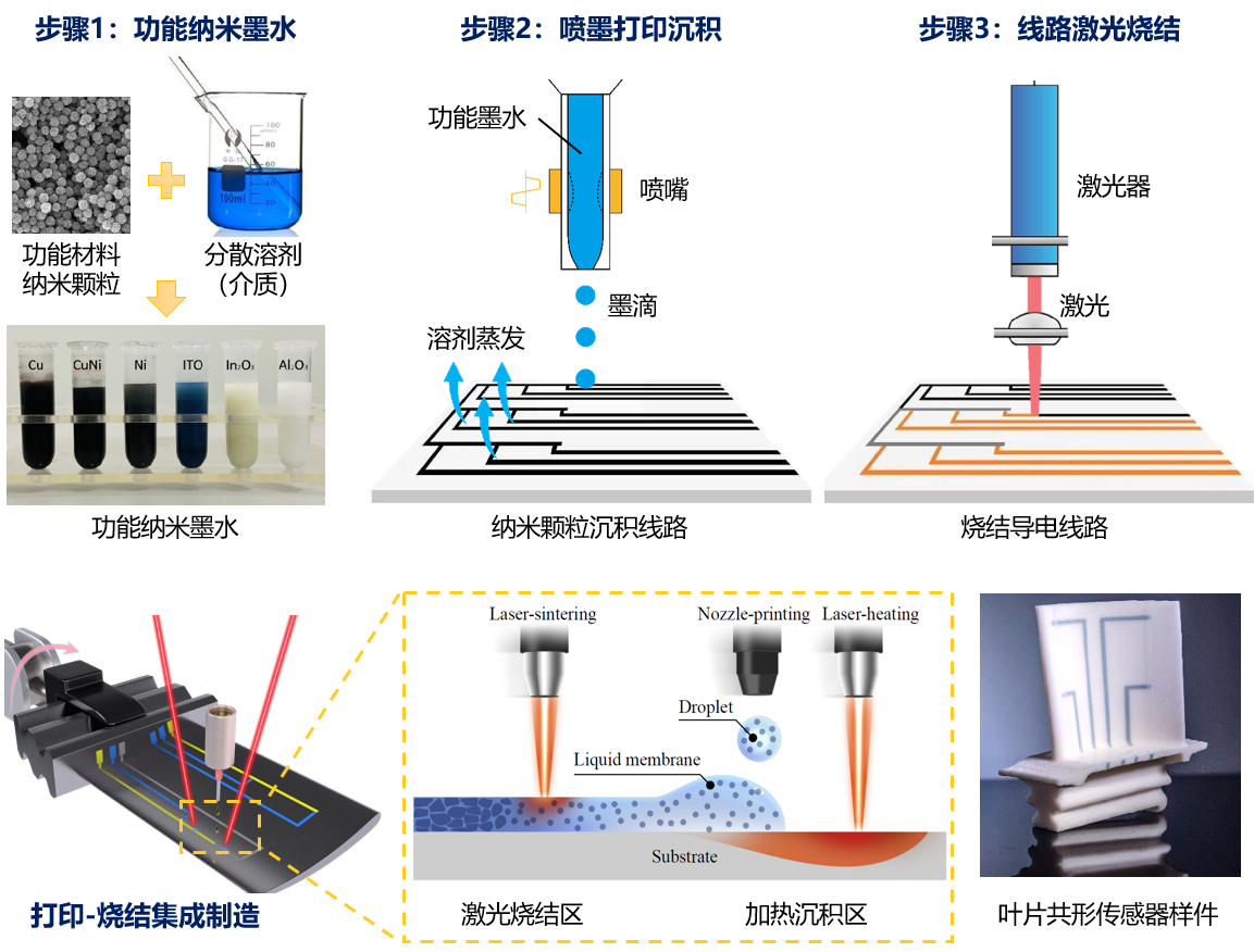 自2018年起,项目研究团队率先开展基于喷墨打印直写成形技术的涡轮叶片高温共形薄膜温度传感器研究,历经七年持续攻关,已形成涵盖纳米功能墨水研制、三维复杂曲面喷墨打印沉积调控、纳米薄膜激光烧结、器件一体化集成测试及高温环境试验验证的全链条技术闭环。