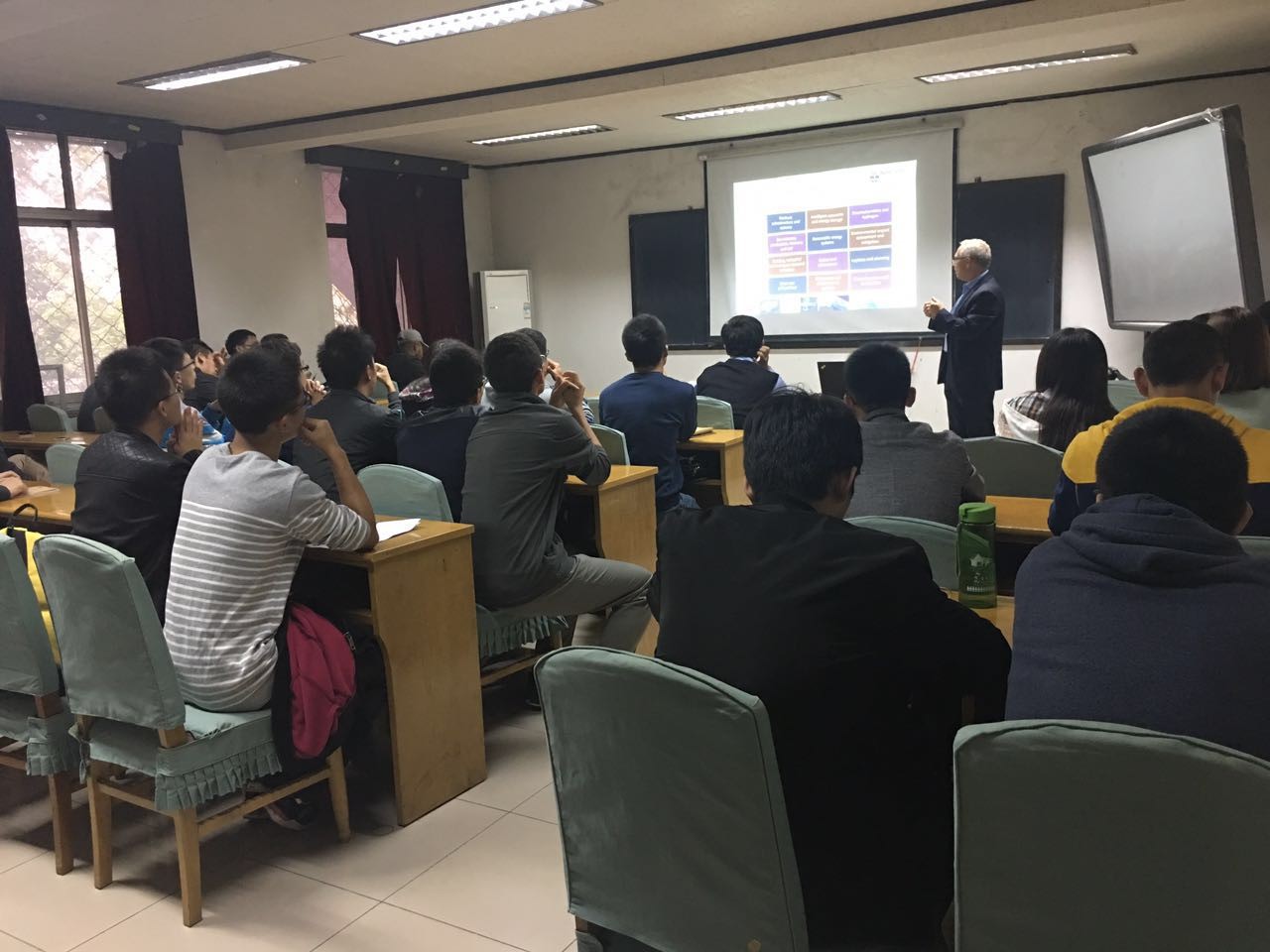 Tony Roskilly教授讲解思路清晰、内容新颖,平时略显枯燥的知识在这场交流会中显得鲜活生动、趣味横生。同学们被他的论述不断带入的同时,引发了对航空替代燃料、新能源开发前景等问题的思考,大家积极现场提出疑问。对于疑问,Tony Roskilly教授都一一耐心解答,并鼓励同学们深入地讨论,激发同学们的创新思维,现场气氛十分活跃。整场报告历时一个半小时。在拓展专业知识的同时,更重要的是激发了同学们思考和质疑的热情,很好地诠释了‘学·问’的魅力。